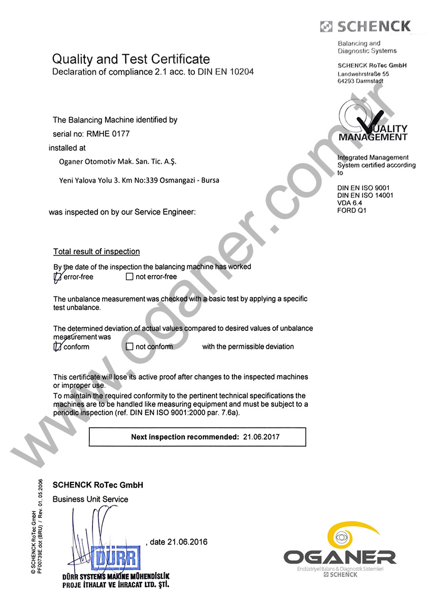 Schenck Endüstriyel Sanayi Balansı Hizmetleri
